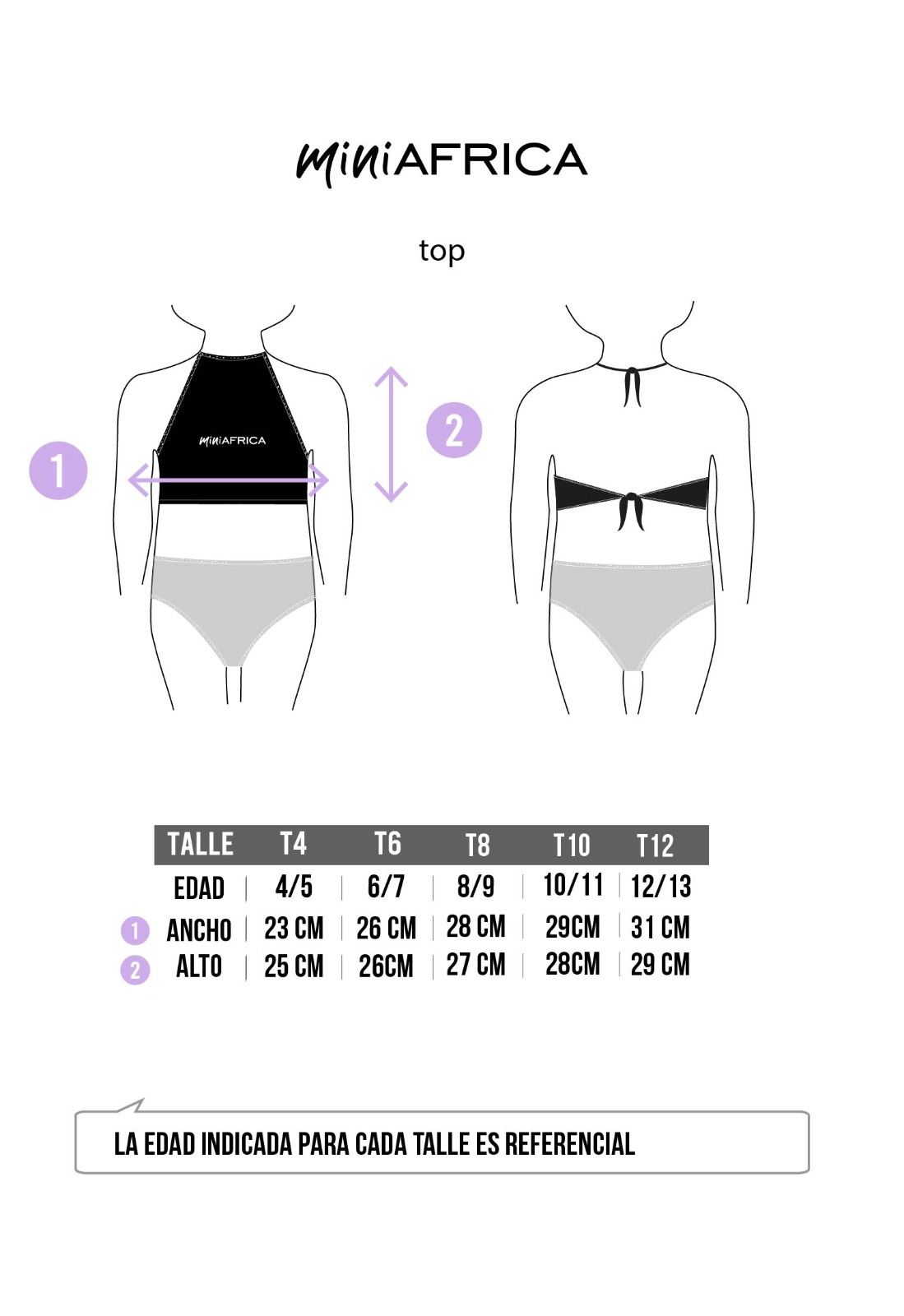 Top niña-teen de lycra estampada premium, con breteles regulables cruzados en su espalda, forrada en su interior para mayor confort, calidad y resistencia de la prenda. Protección UVA-UVB 50+.