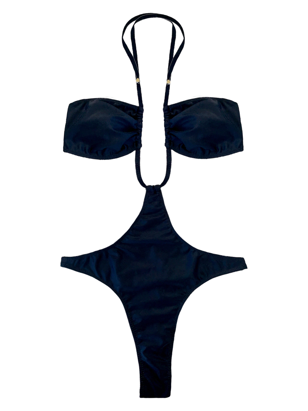 Enteriza trikini semi colaless de lycra lisa negra premium. Sus tiras son de lycra regulables y se anuda en espalda y frente. Es resistente al cloro y mar. Composición: 80% polyester y 20% elastano.
